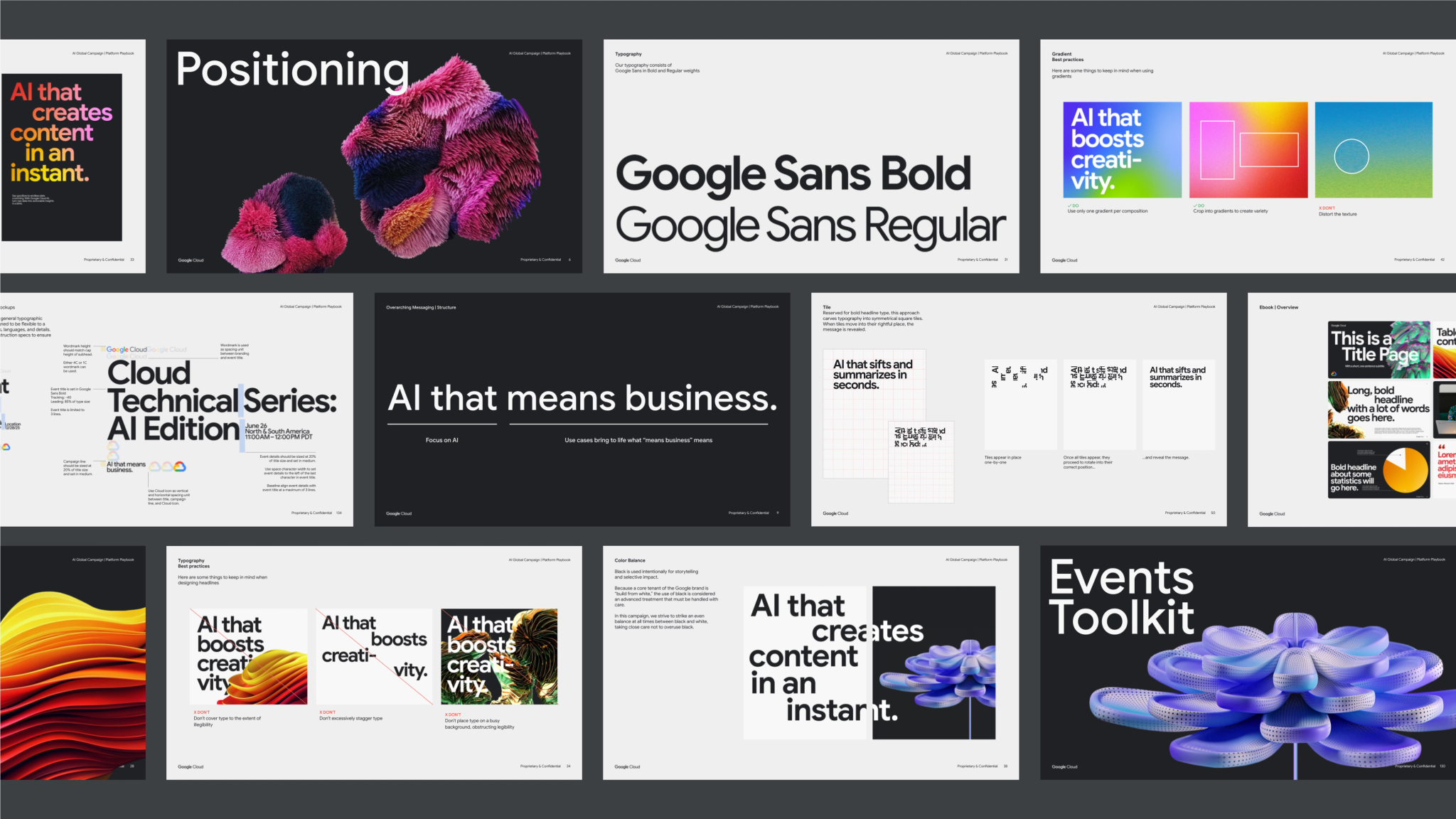 Google Cloud needed to stand out as a B2B leader, so we built them a playbook that outlined how. Our visual identity was centered around inspiring 3D gen AI visuals created with Vertex AI, and we paired that with bold messaging and a unique motion identity. Together, these elements brought vibrancy to both static and motion formats. This playbook helped lay the foundation for all campaign work and is being applied across a variety of markets globally.